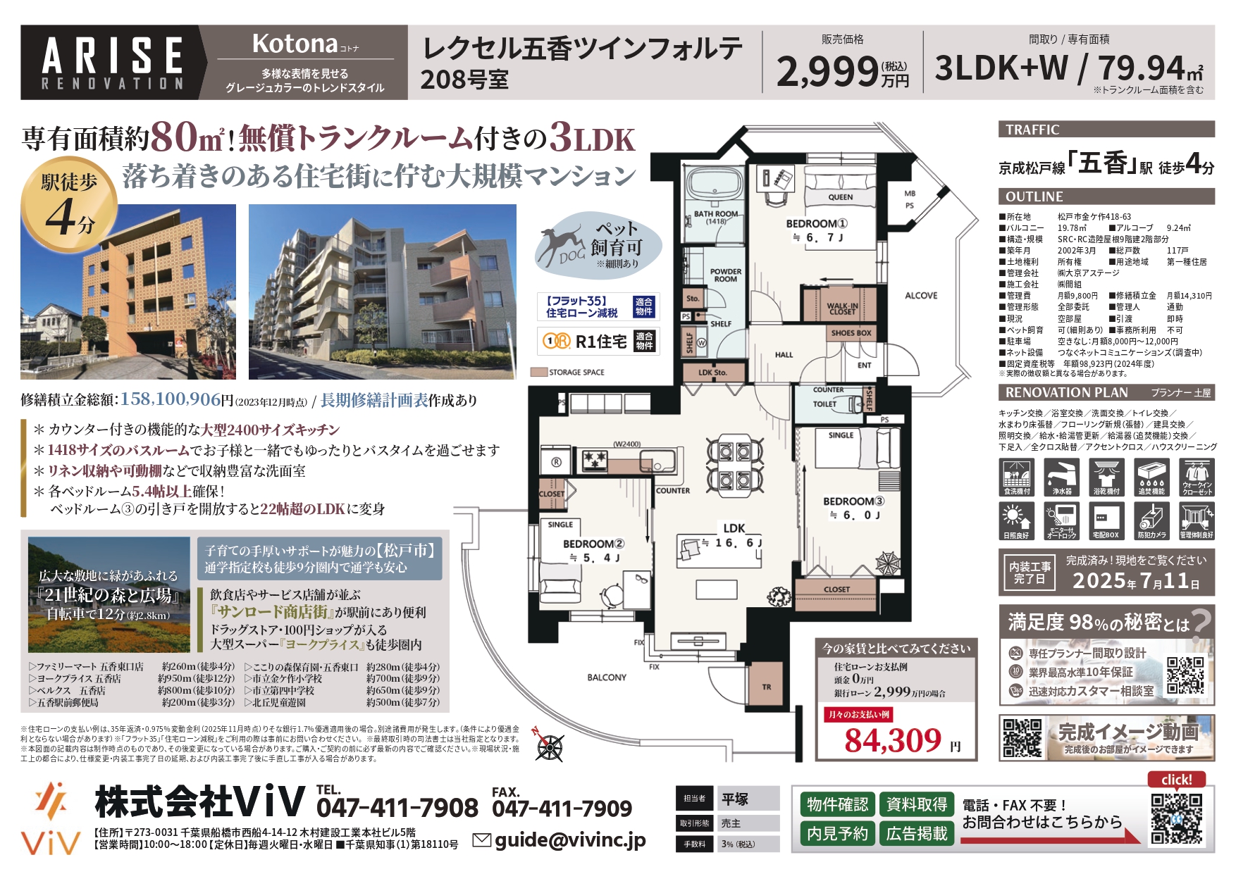 マンション レクセル五香ツインフォルテ208号室 レクセル五香ツインフォルテ208号室 2999万円 駅徒歩4分の好立地♪ 専有面積約80㎡!無償トランクルーム付きの3LDK 修繕積立金総額:158,100,906円(2023年12月時点)/長期修繕計画表作成あり 広大な敷地に緑があふれる『21世紀の森と広場』自転車で12分 飲食店やサービス店舗が並ぶ『サンロード商店街』が駅前に有 ドラッグストア・100円ショップが入る大型スーパー『ヨークプライス』も徒歩圏内 ペット飼育可(※細則あり)