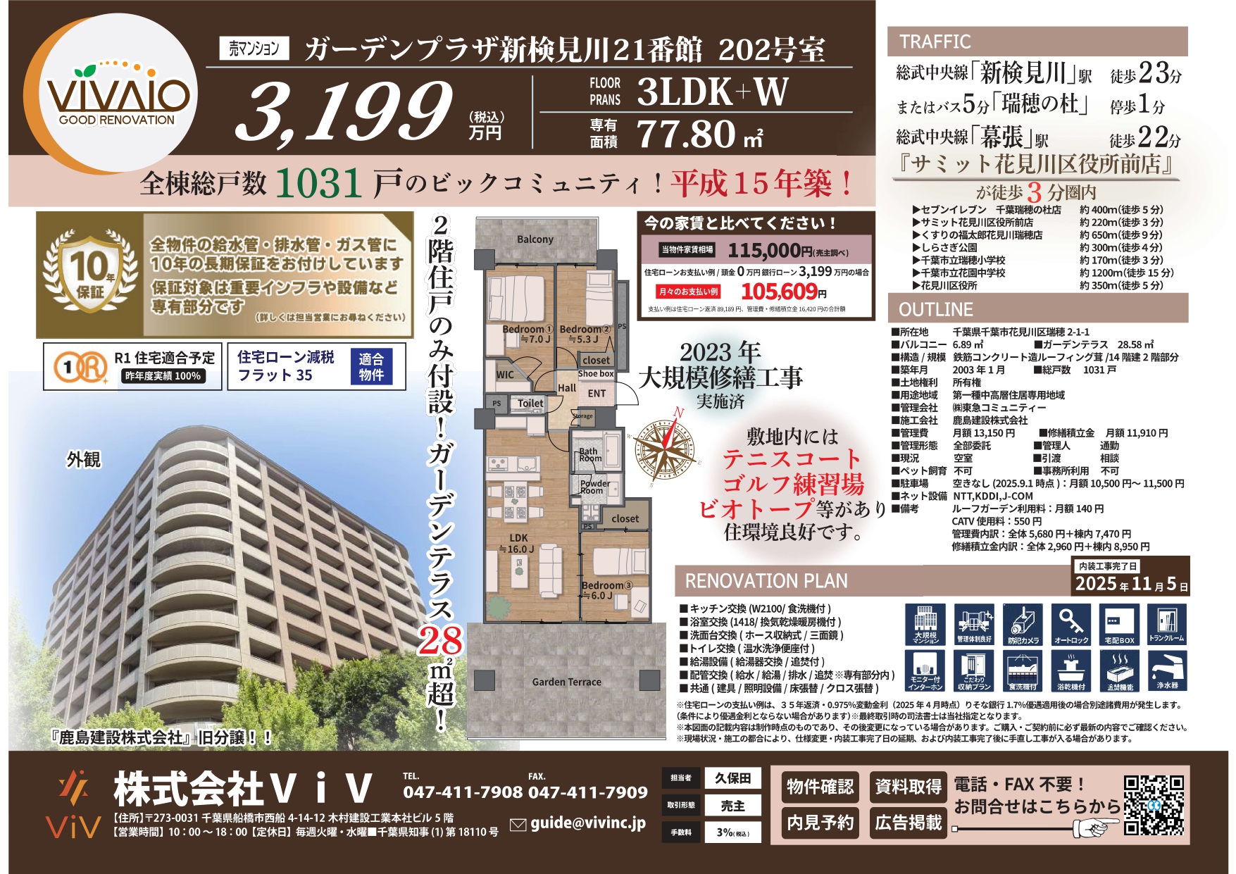 マンション ガーデンプラザ新検見川21番館 202号室 ガーデンプラザ新検見川21番館202号室 3199万円 全棟総戸数1031戸!大規模コミュニティ! 2階住居のみ付設!ガーデンテラス28㎡超! 『サミット花見川区役所前店』が徒歩3分圏内 敷地内にはテニスコート・ゴルフ練習場・ビオトープ等があり住環境良好♪ 2023年大規模修繕工事実施済み 安心の10年保証付き♪(対象は重要インフラや設備など専有部分です。詳しくは営業担当まで!)