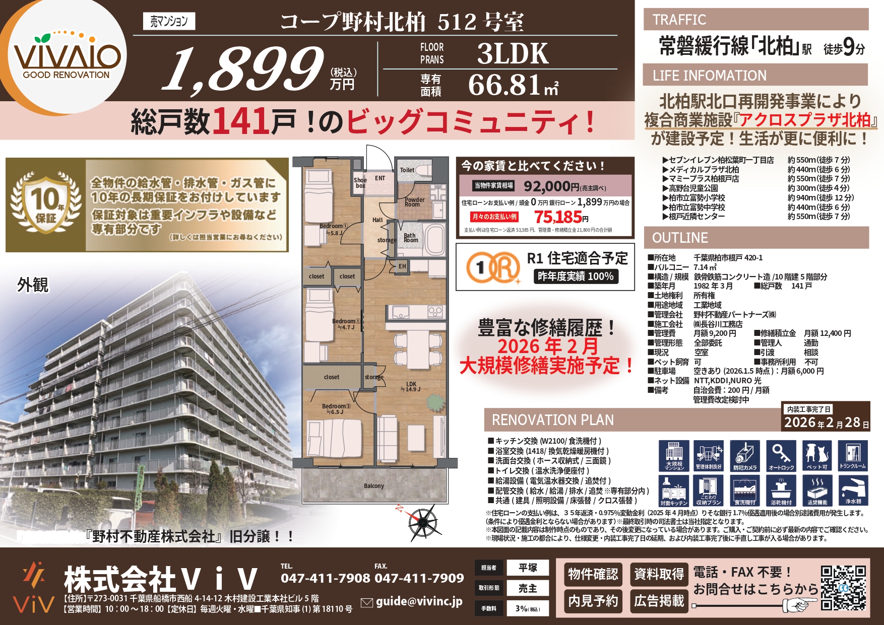 マンション コープ野村北柏512号室 コープ野村北柏512号室 1899万円 総戸数141戸!のビッグコミュニティ! 北柏駅北口再開発事業により複合商業施設『アクロスプラザ北柏』が建設予定♪ 安心の10年保証付き!(詳しい内容は担当営業にお尋ねください) 豊富な修繕履歴! 2026年2月大規模修繕実施予定
