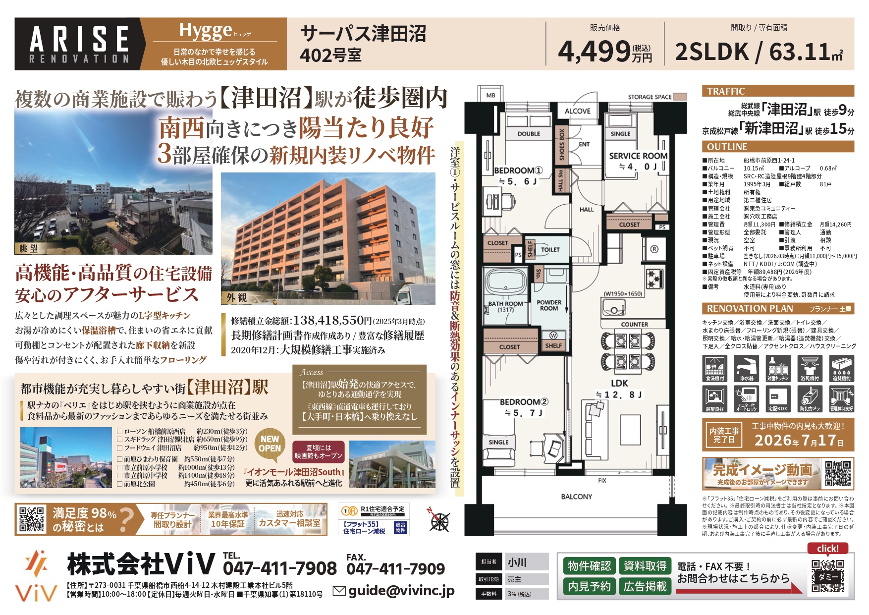 マンション サーパス津田沼402号室 サーパス津田沼402号室 4499万円 複数の商業施設で賑わう【津田沼】駅が徒歩圏内 南西向きにつき陽当たり良好 3部屋確保の新規内装リノベ物件 高機能・高品質の住宅設備 安心のアフターサービス 都市機能が充実し暮らしやすい街【津田沼】駅 駅ナカの『ペリエ』をはじめ駅を挟むように商業施設が点在 『イオンモール津田沼South』NEW OPEN 修繕積立金総額:138,418,550円(2025年3月時点) 長期修繕計画書作成あり/豊富な修繕履歴 2020年12月:大規模修繕工事実施済み