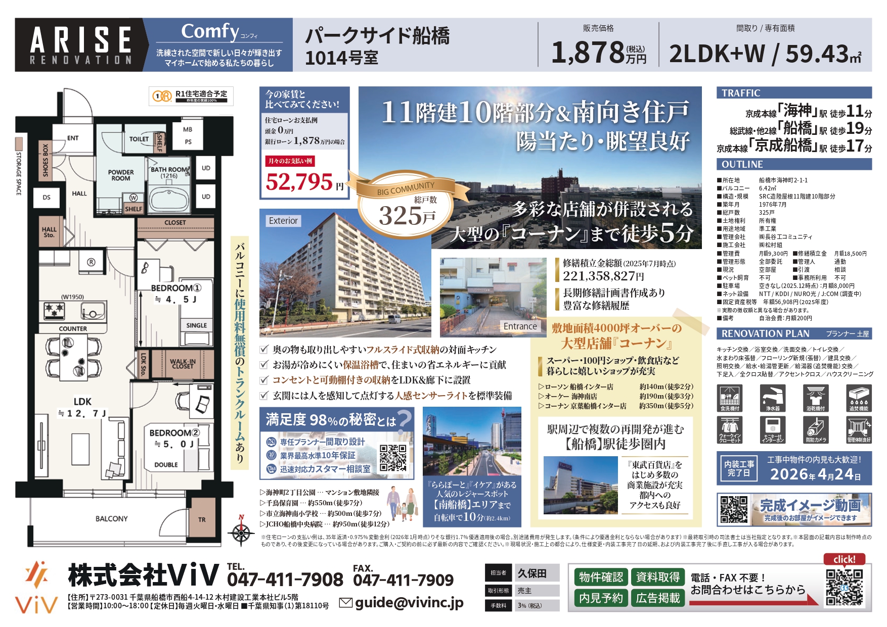 マンション パークサイド船橋1014号室 パークサイド船橋1014号室 1878万円 11階建10階部分&南向き住戸で陽当たり・眺望良好! バルコニーに使用料無償のトランクルームあり♪ 駅周辺で複数の再開発が進む【船橋】駅徒歩圏内 多彩な店舗が併設される大型の『コーナン』まで徒歩5分 『ららぽーと』『IKEA』がある人気のレジャースポット【南船橋】エリアまで自転車で10分(約2.4km) 修繕積立金総額:221,358,827円(2025年7月時点) 長期修繕計画書作成あり/豊富な修繕履歴